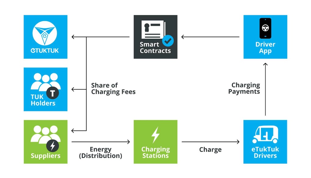 eTukTuk segue un sistema di pagamento e addebito peer-to-peer. I sistemi di ricarica sono installati e gestiti dai partner territoriali in ciascuna sede. La rete di pagamento, invece, è protetta da Power Stakers. Il Power Staking consente agli utenti di tutto il mondo di diventare parte del progetto.