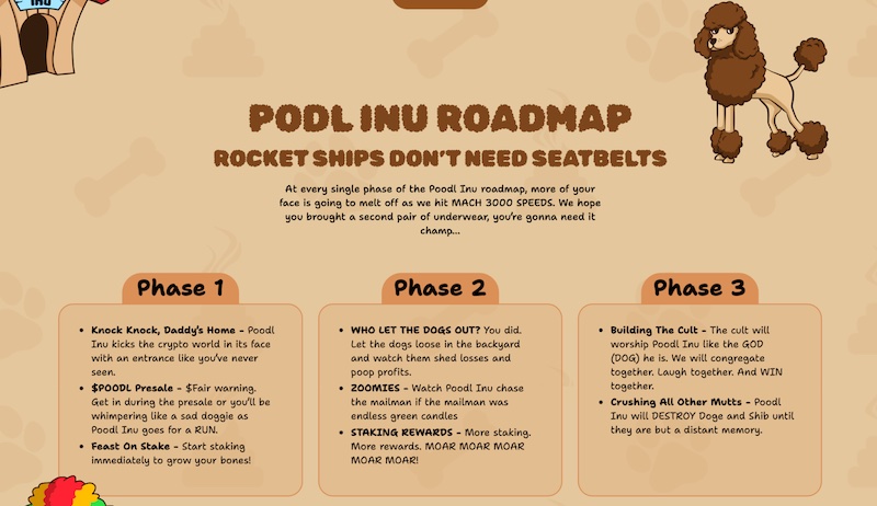 Il Poodle Inu gli sviluppatori hanno delineato una tabella di marcia ambiziosa, divisa in tre fasi distinte. Ogni fase è progettata per spingere il progetto verso livelli più alti, con particolare attenzione al coinvolgimento della comunità, alla crescita e, in definitiva, al dominio nel mercato delle monete meme.