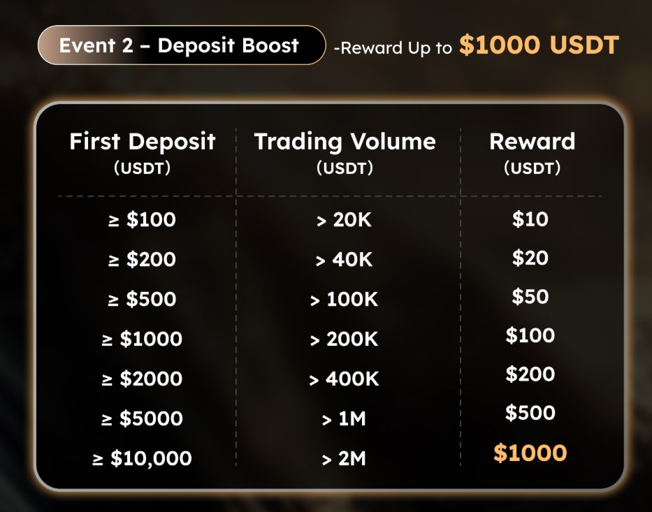 Nelle prime fasi, l’iscrizione dà fino a $470 come spinta iniziale, il deposito on-chain aggiunge un 10% fino a $1.000, poi entra in gioco il meccanismo trade-to-earn che può portare fino a $20.000. Un pacchetto unico e piuttosto diretto.