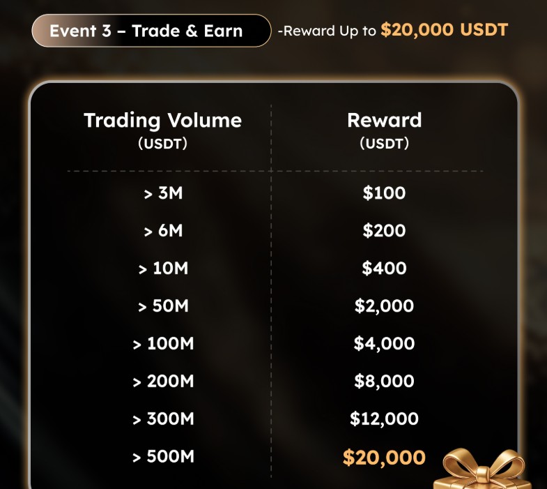 Se il volume complessivo raggiunge i livelli alti della promo, il trade-to-earn può portare fino a $20.000 in ulteriori premi. La struttura a scaglioni rende chiaro quanto manca al livello successivo e incentiva a pianificare il ritmo delle operazioni.