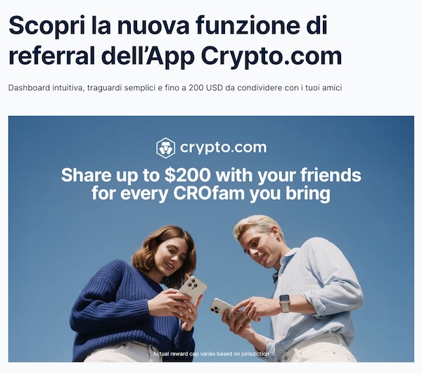 - Vecchio Programma Referral Crypto.com (2024): Fino a $50 in CRO ciascuno, sbloccati completando vari compiti (scambiare $100 di crypto idonee, mettere in staking CRO e scambiare valuta fiat).