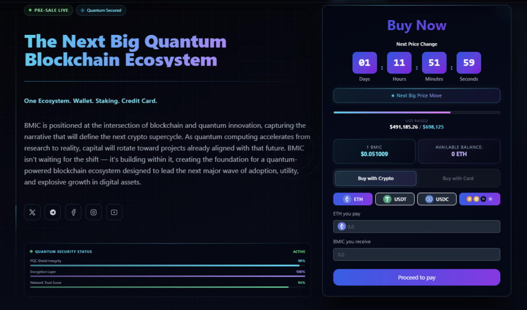 BMIC ($BMIC), un progetto che sta costruendo la prima infrastruttura finanziaria completamente sicura contro i computer quantistici, ha raccolto quasi 500.000 dollari nella sua prevendita di criptovalute. I primi acquirenti si stanno posizionando prima che il mercato più ampio se ne accorga.