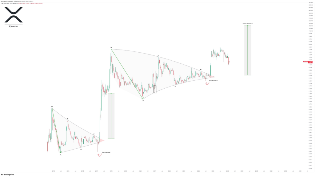 Il grafico condiviso da Javon Marks delinea una struttura triangolare simmetrica pluriennale che risale al picco di XRP del 2018. L’osservazione chiave si concentra su una rottura avvenuta alla fine del 2024, in seguito a quello che sembra essere un falso breakout vicino all’apice della formazione. Questo falso movimento ha inondato la liquidità prima che il prezzo invertisse la rotta in modo aggressivo verso l’alto; una classica configurazione di deviazione.