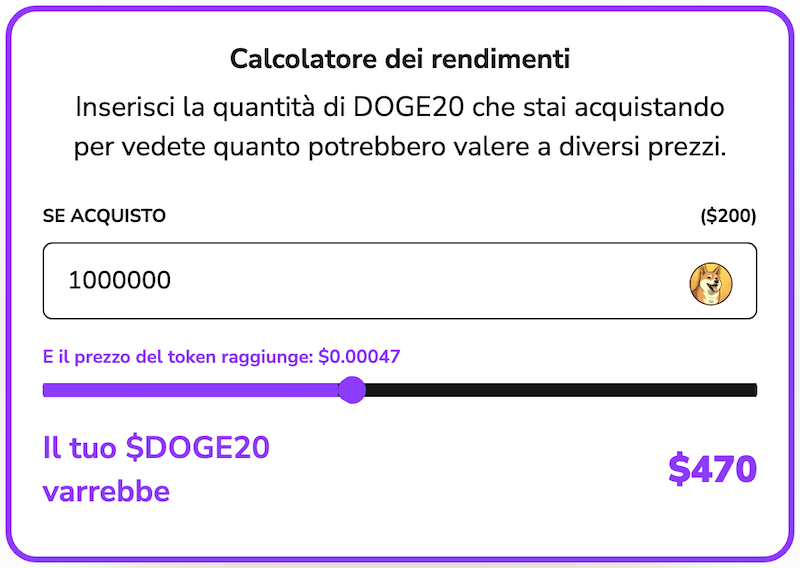 Con un APY del 361%, mettere oggi in staking 10.000 DOGE20 significa poterne avere 36.100 il prossimo anno, quando il loro valore sarà inevitabilmente lievitato anche per effetto della fine della prevendita.