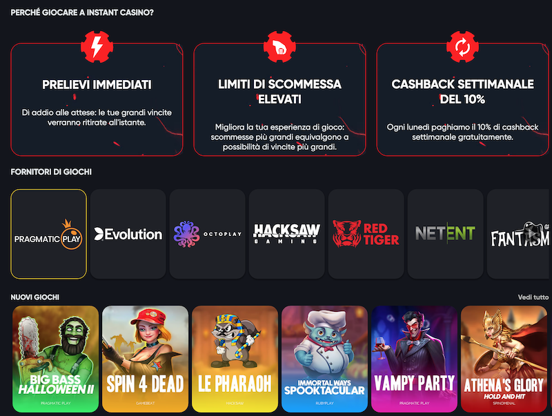 Instant Casino è uno dei migliori nuovi casinò online per guadagnare giocando, grazie a un’ampia selezione di giochi e un’interfaccia intuitiva. Fondato nel 2024, il casinò online offre oltre 3.000 giochi tra slot, tavoli da casinò live, scommesse sportive e lotterie, garantendo un’esperienza completa per ogni tipo di giocatore. La vasta scelta di eventi sportivi consente di piazzare scommesse su numerosi mercati, aumentando le opportunità di vincita.