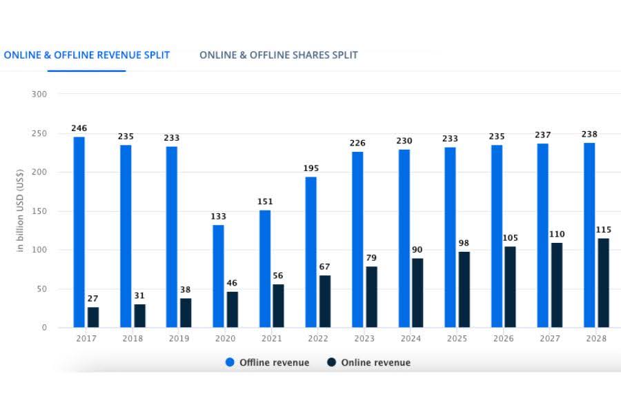 I numeri elaborati dal noto sito di previsioni e analisi Statista, indicano che il mercato del gambling online in tutto il mondo raggiungerà un fatturato di 107,30 miliardi di dollari entro il 2024, che diventeranno 138,10 miliardi di dollari entro il 2028. Le stime considerano un tasso di crescita annuo (CAGR) del 6,51% nel periodo compreso tra 2024-2028.