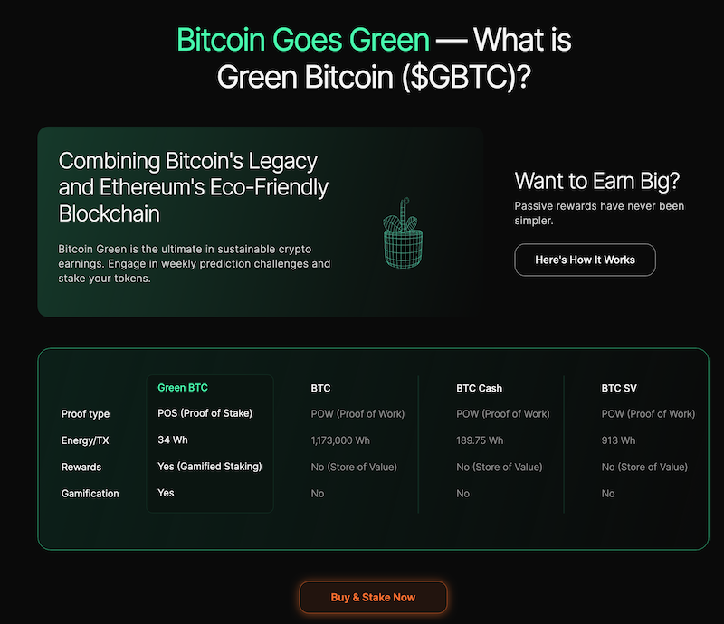Green Bitcoin introduce un modello di staking unico, detto Gamified Green Staking, che non solo premia gli investimenti ma incoraggia anche la partecipazione attiva nella comunità attraverso varie sfide e meccanismi di previsione dei prezzi.