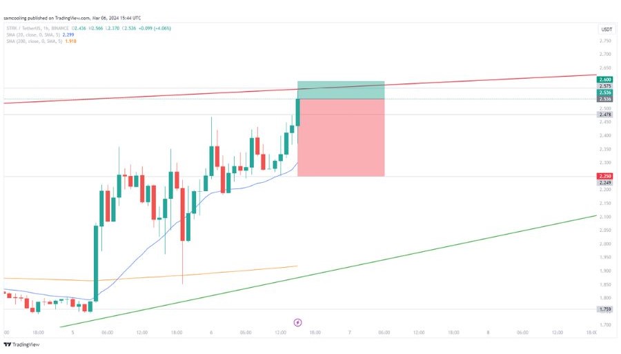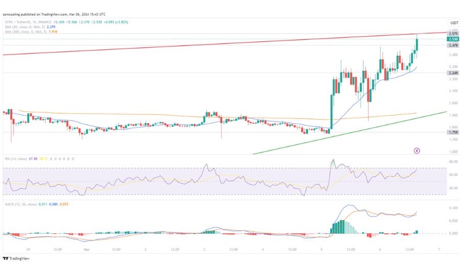 Dopo un’azione dei prezzi a martello oltre la linea di tendenza superiore che ha portato a un guadagno dell’11,4% a quota $2,51, oggi STRK perde il 3,52% e va a $2,31.