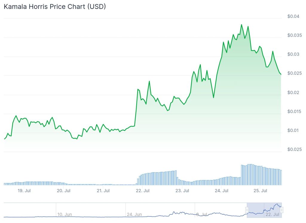 La meme coin parodia della Vice Presidente democratica Kamala Harris ha lentamente guadagnato popolarità nelle ultime settimane, anche prima del ritiro di Biden.