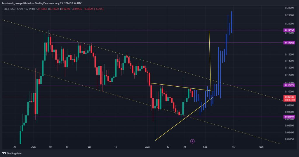 La vera spinta è arrivata con la notizia su X che Binance Futures lancerà un contratto perpetual su $BRETT con margine in USD. Forse è questo il motivo che ha alimentato il trend rialzista del prezzo di $BRETT fino alla fine della scorsa settimana.