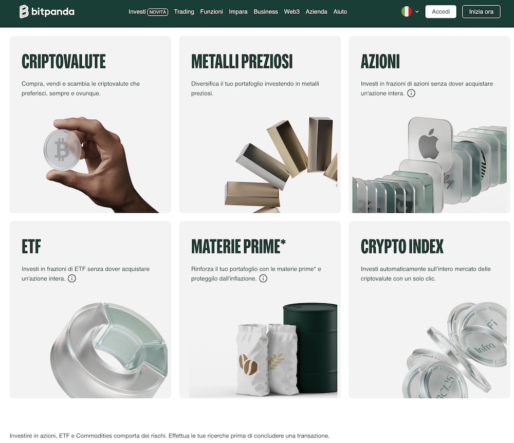 Bitpanda si presenta come piattaforma europea multi-asset pensata per investire in modo semplice e quotidiano, con accesso a: